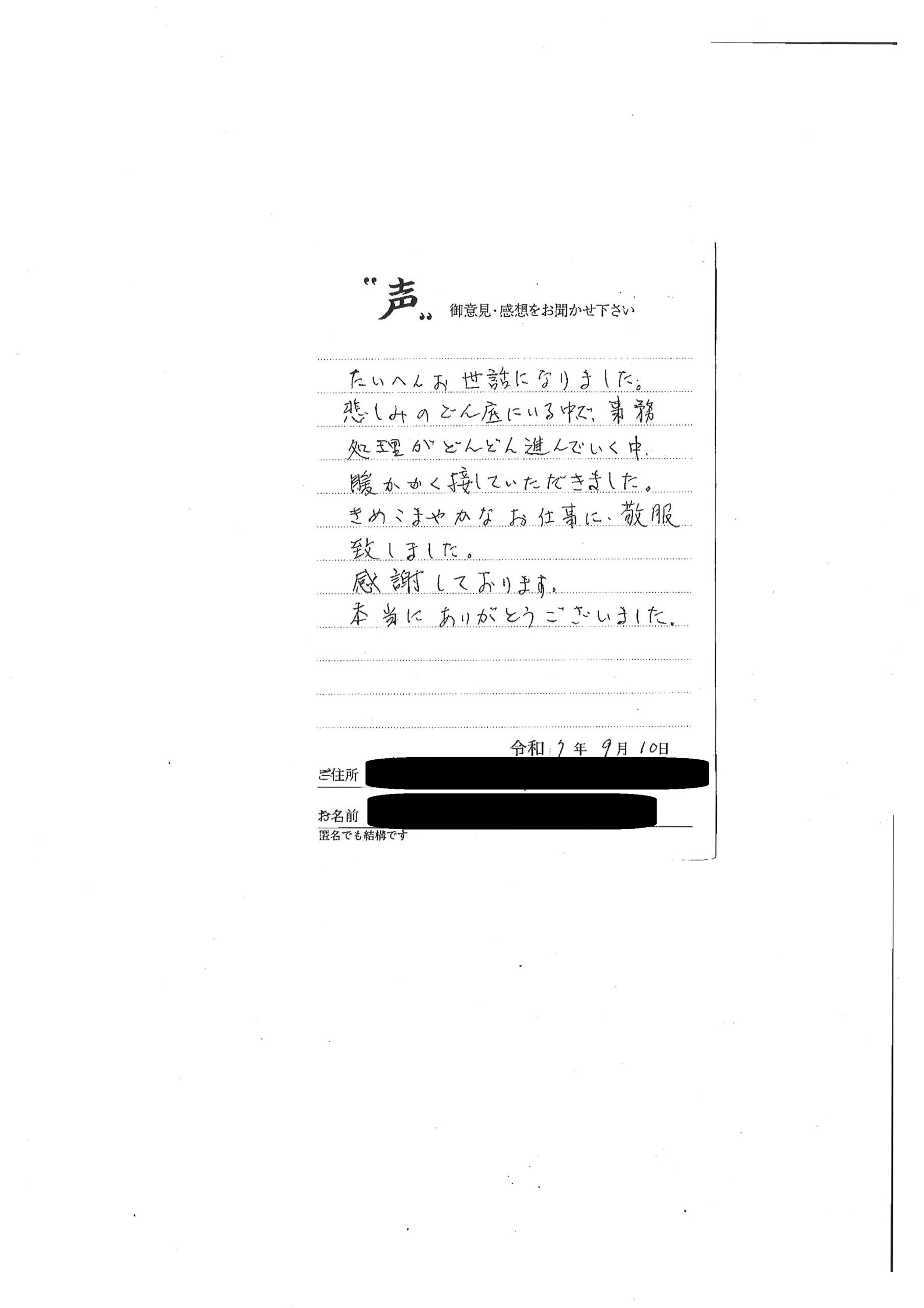 たいへんお世話になりました。悲しみのどん底にいる中で事務処理がどんどん進んでいく中、暖かく接していただきました。きめこまやかなお仕事に敬服致しました。感謝しております。 本当にありがとうございました。