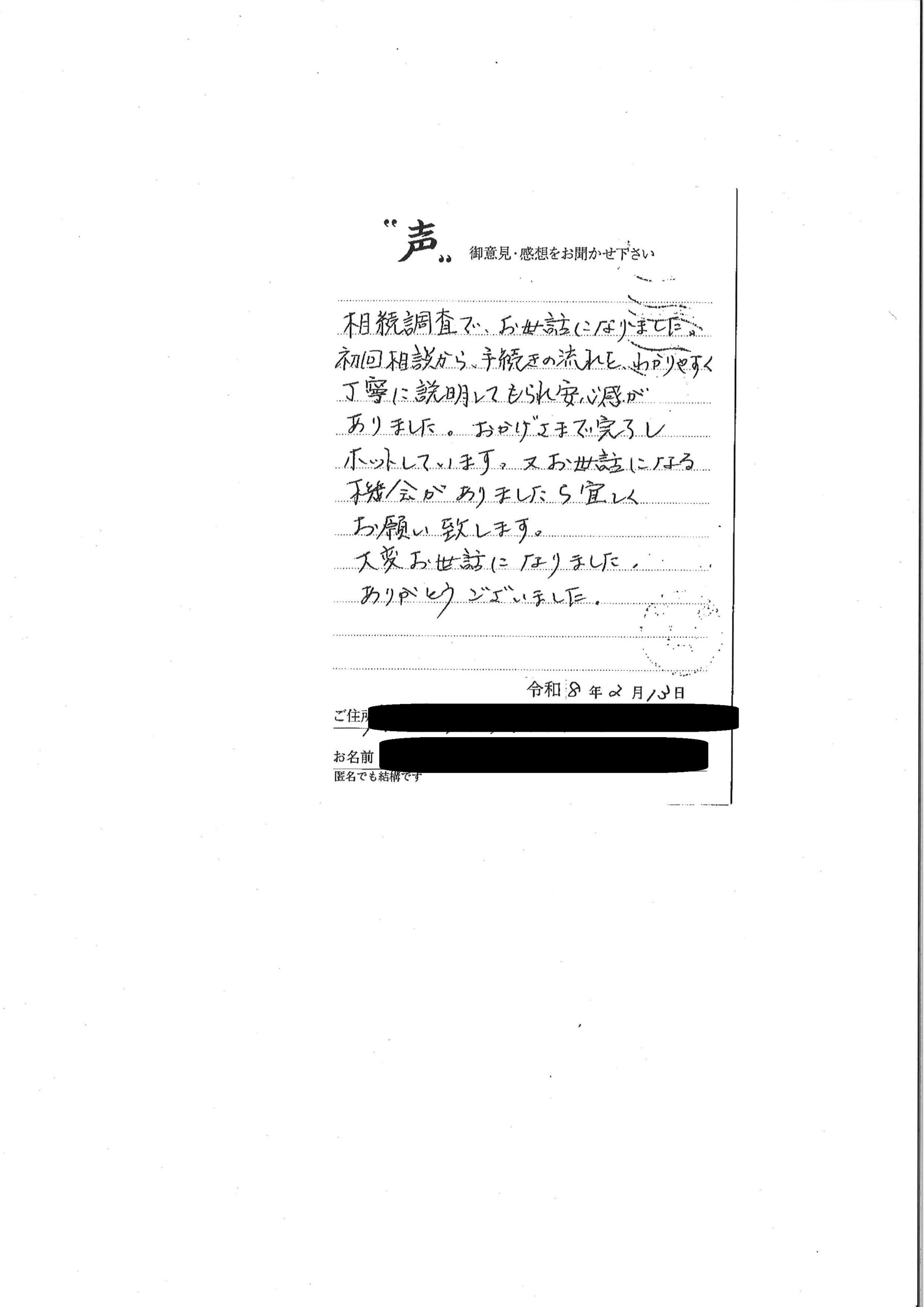 相続調査でお世話になりました。初回相談から手続きの流れをわかりやすく丁寧に説明してもらえ安心感がありました。おかげさまで完了しホッとしています。 又お世話になる機会がありましたら宜しくお願い致します。大変お世話になりました。ありがとうございました。